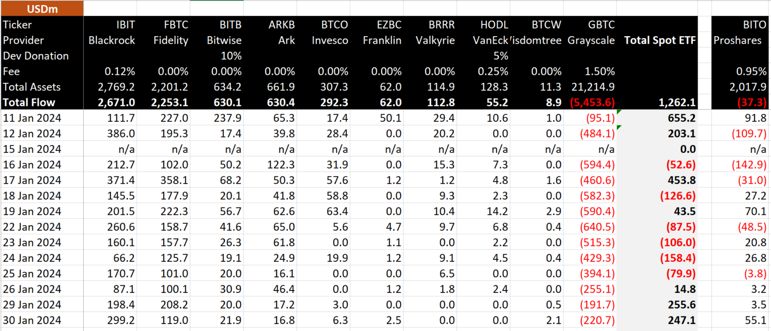 Los ETF de Bitcoin han creado una demanda excepcionalmente grande desde su lanzamiento. Inicialmente, este aumento de la demanda se moderó un poco debido a importantes salidas del ETF de Bitcoin en escala de grises (GBTC). Sin embargo, el día 13 de los ETF de Bitcoin mostró una vez más que las salidas en escala de grises se están desacelerando lentamente (ayer: 220,7 millones de dólares, anteriormente 191,7 millones de dólares), mientras que en los dos últimos días de negociación se registraron entradas netas para todos los emisores de ETF de alrededor de 250 millones de dólares.