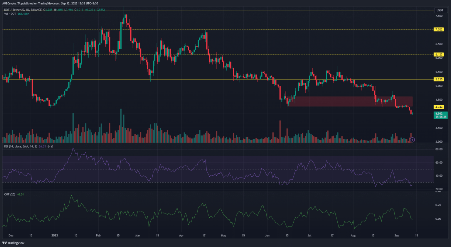 Sin embargo, la presión de venta sobre el DOT y el sesgo bajista en el mercado de criptomonedas hicieron que registrara otra caída significativa. Mientras tanto, Bitcoin [BTC] continuó cotizando dentro del rango de $ 25,8 mil después de recuperarse de la fuerte caída a $ 25 mil durante el último día.