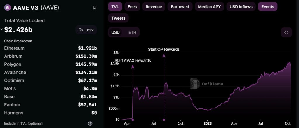 Pero, ¿cuánto crecimiento ha logrado Aave y qué significa esto para el futuro del protocolo? Bueno, Aave V3 es el representante ideal de ese crecimiento considerando su crecimiento positivo de TVL desde principios de 2023. Su TVL alcanzó recientemente un máximo de $ 2,59 mil millones a principios de octubre. En perspectiva, el TVL de Aave fue inferior a 500.000 dólares en su nivel más bajo en enero de 2023.