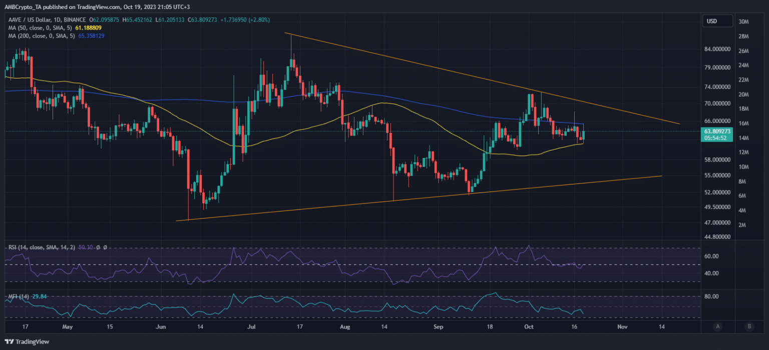 AAVE ha sido una de las mejores criptomonedas para los comerciantes que buscan comerciar. Esto se debe a que ha estado operando en un patrón de cuña respaldado por una resistencia descendente y un soporte ascendente.