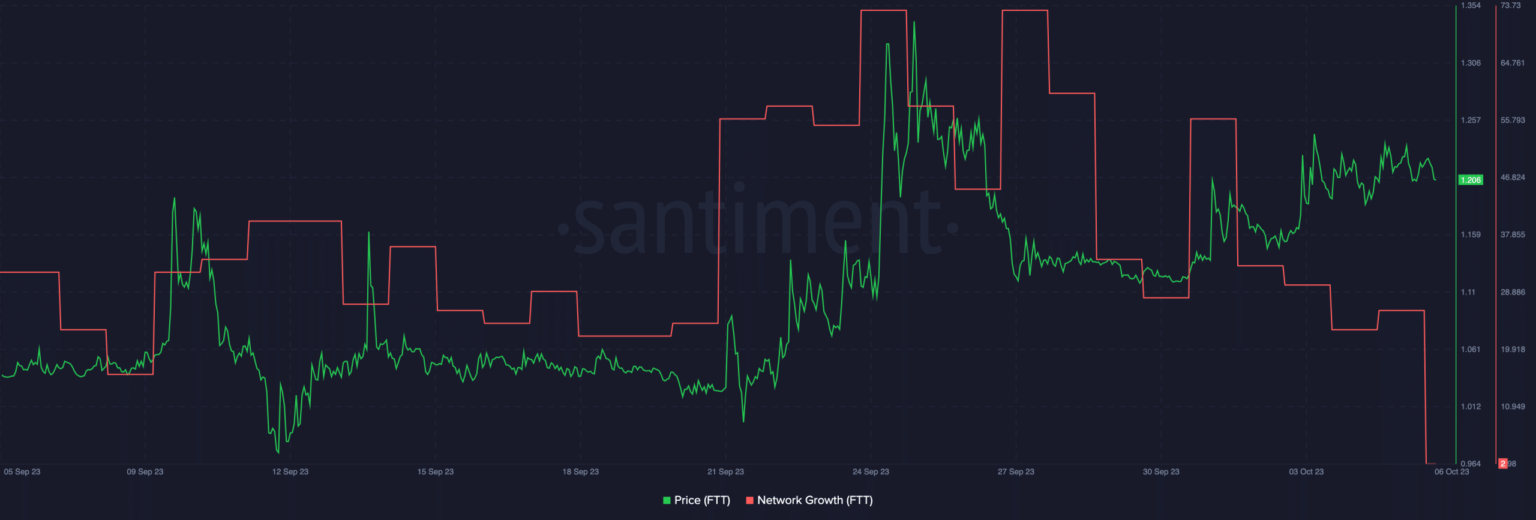 En el momento del último informe, FTT cotizaba a 1,206 dólares. Sin embargo, es fundamental destacar que el crecimiento de la red de FTT experimentó una caída notable, lo que sugiere un menor interés por parte de nuevas direcciones.