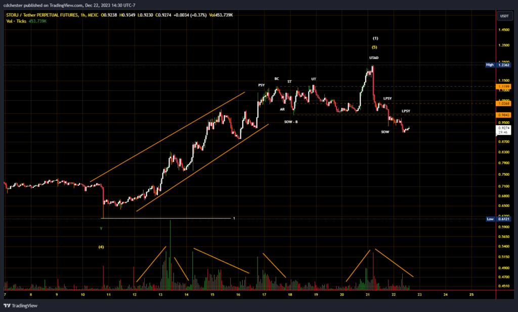El rango de negociación de Storj era de 1 dólar a 1,12 dólares y, concretamente, ha caído por debajo de ese nivel. En la imagen siguiente se ha producido una SOW importante, lo que indica más bien que se está produciendo una distribución. Esto también coincide con la opinión de nuestro analista Elliott Wave (EWT) sobre Storj. Predicen un pequeño repunte a medida que Storj continúa cayendo en su Ola 2. La mayor parte de la liquidez (según su perfil de volumen relevante) está entre el 38,2% y el 61,8% LFR a $0,56 y $0,76 respectivamente. Normalmente se espera un grupo de liquidez entre estos LFR en EWT, lo que nos lleva a pensar que se está produciendo una corrección de la Ola 2. Además, el grupo se encuentra en el rango de precios de la subonda 4, una pauta del EWT.