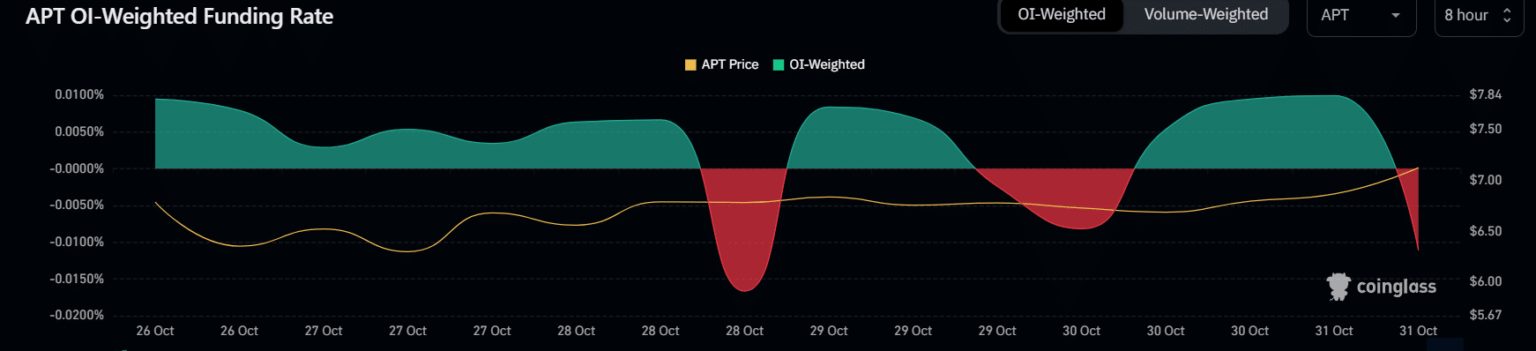 Si hay que creer en las métricas, el repunte alcista de APT podría terminar incluso antes de que se desbloquee el token. Según Coinglass, la tasa de financiación de APT se volvió roja al momento de esta publicación. Esto demostró que los inversores en derivados se mostraron reacios a comprar APT a un precio más alto.