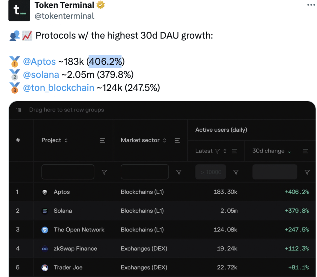 Este aumento de actividad convirtió a Aptos en el protocolo número uno con mayor crecimiento en términos de DAU. Solana quedó en segundo lugar, con Ton detrás en la posición número tres con un aumento del 247% de DAU.