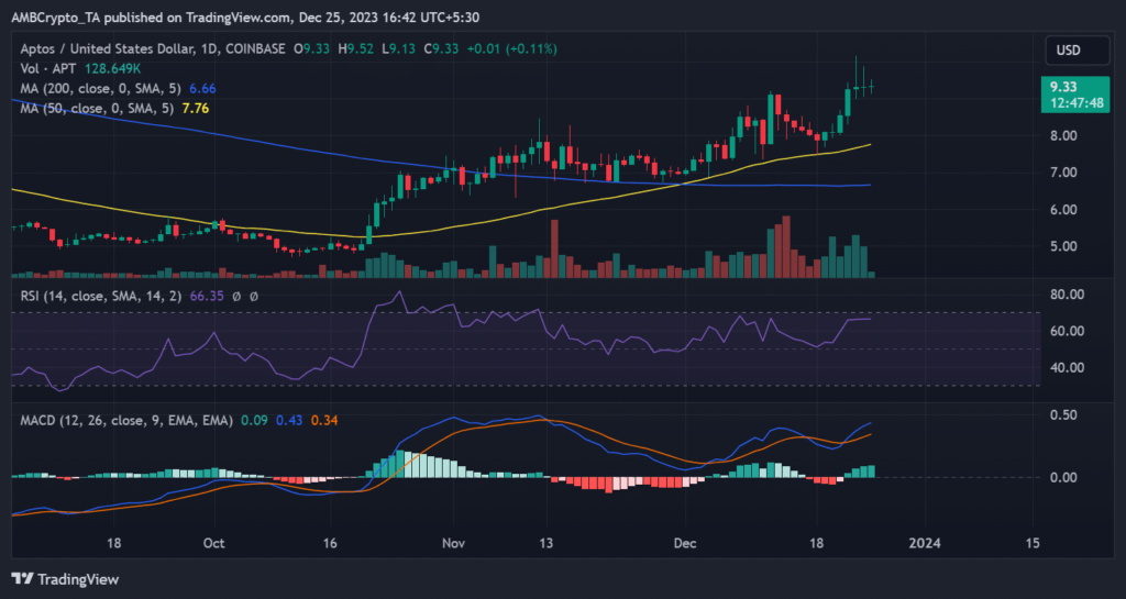 El análisis del gráfico de tiempo diario de Aptos mostró que había experimentado un período de ganancias comerciales en los últimos días. A pesar de ello, las ganancias acumuladas se han mantenido dentro del 1%.