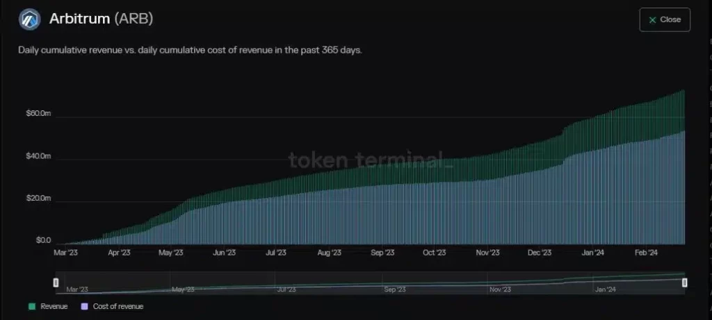 arbitraje [ARB]posiblemente un barómetro del desempeño de la industria, generó ingresos de más de $ 72 millones durante el año pasado, según el escrutinio de AMBCrypto de los datos de Token Terminal.