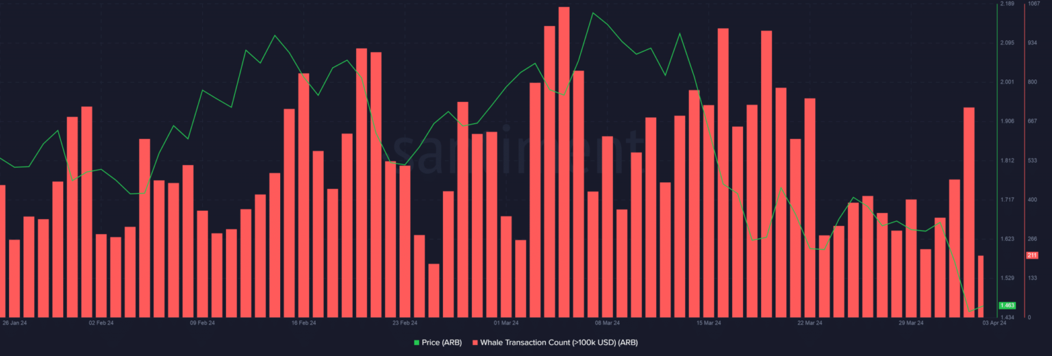 Incluso los dos primeros días de abril registraron un aumento en las transacciones de ballenas, lo que resultó en nuevas caídas en el precio, notó AMBCrypto utilizando los datos de Santiment.
