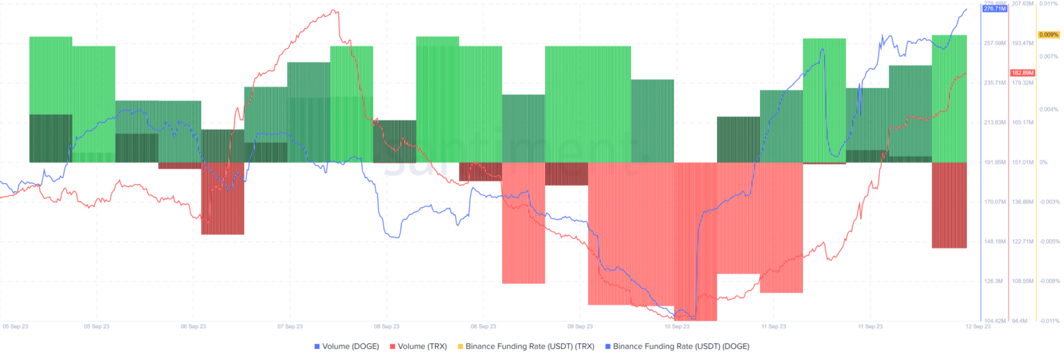 Fue interesante observar que ambas monedas tuvieron altos volúmenes de negociación durante la última semana. Se observó una disparidad en sus tasas de financiación, ya que TRXLa métrica de DOGE era verde, lo que refleja su demanda en el mercado de derivados, mientras que la tasa de financiación de DOGE era roja.