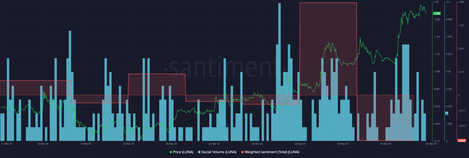 Sin embargo, fue sorprendente ver que a pesar del aumento de su precio, el sentimiento ponderado de LUNA cayó, lo que significa que el sentimiento bajista en torno al token era dominante en el mercado.