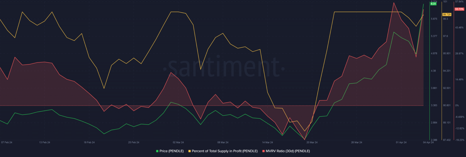 La tendencia alcista provocó un fuerte aumento en la rentabilidad de los tenedores de monedas. De hecho, según el análisis de AMBCrypto de los datos de Santiment, alrededor del 99,73% del suministro total de PENDLE estaba en ganancias al momento de esta publicación.