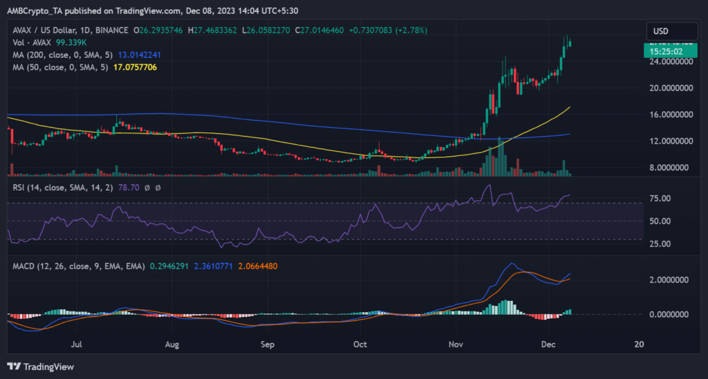 En particular, AVAX ha alcanzado un rango de precios que no se había observado desde agosto de 2022 aproximadamente. En el momento de escribir este artículo, se cotizaba a alrededor de 26,8 dólares, con un aumento de valor de más del 2%.