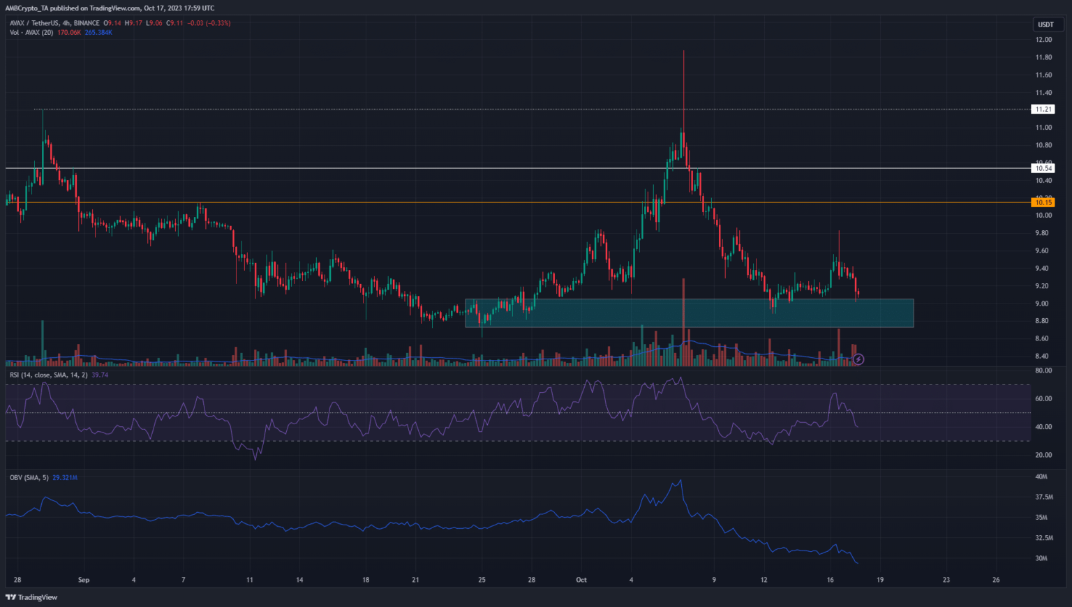 Un análisis reciente de precios de AMBCrypto de Avalanche destacó que una caída por debajo de $ 9,5 reflejaría un intenso sentimiento bajista en el mercado. Subrayó los 9,3 y 9 dólares como niveles de soporte provisionales. Al cierre de esta edición, $9 estaba amenazado por la presión de venta.