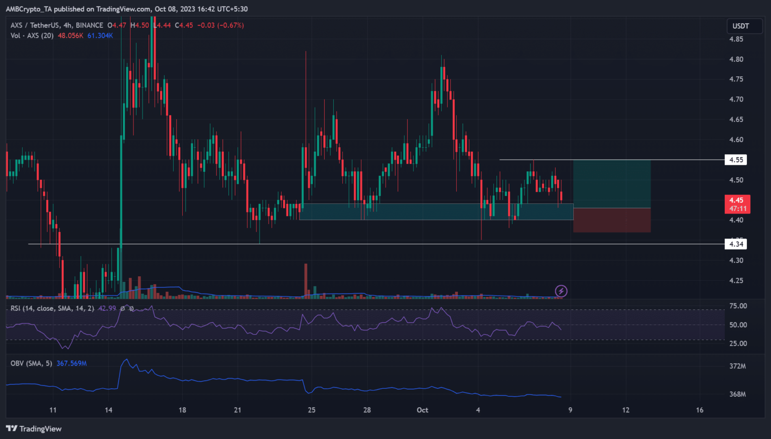 Al cierre de esta edición, el reciente retroceso se ha aliviado en el soporte local. Si la tendencia anterior se repite y bitcóin [BTC] no registra pérdidas adicionales a corto plazo, AXS podría rebotar a la zona de demanda y soporte local de $4,40 -$4,44 (cian).