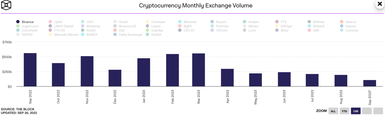 En medio de estos desafíos, Binance enfrentó otra realidad aleccionadora: una disminución sustancial en el volumen de operaciones. Según datos de The Block, el volumen de operaciones de la bolsa se desplomó de 556 mil millones de dólares a 107,8 mil millones de dólares desde marzo.