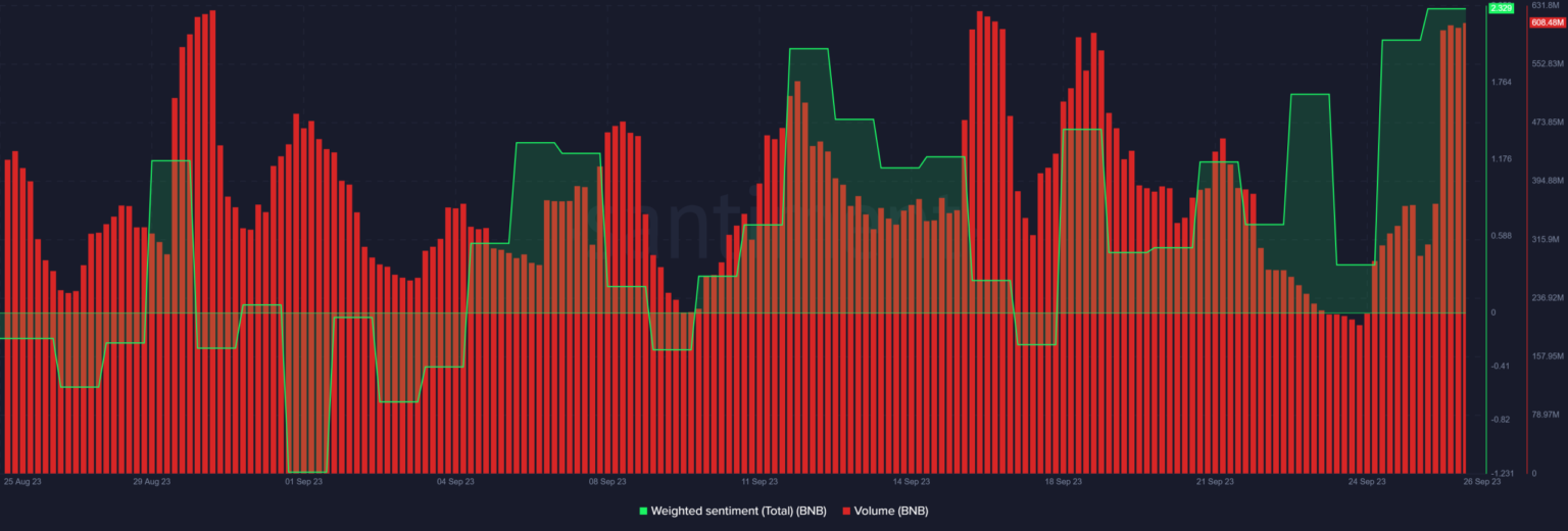 BNB también mantuvo volúmenes saludables en la cadena en línea con la mejora del sentimiento. La métrica de volumen acaba de alcanzar su punto más alto en lo que va del mes.