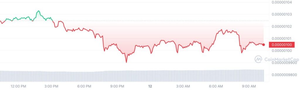 La Pepe Coin (PEPE), una criptomoneda meme publicitada, cayó significativamente hoy. En el momento de esta publicación, el precio de Pepe Coin bajó un 1,96% a 0,000001005 dólares con una valoración de mercado de 422,75 millones de dólares. Por el contrario, su volumen comercial de 24 horas aumentó un 9,41% hasta los 66,19 millones de dólares.
