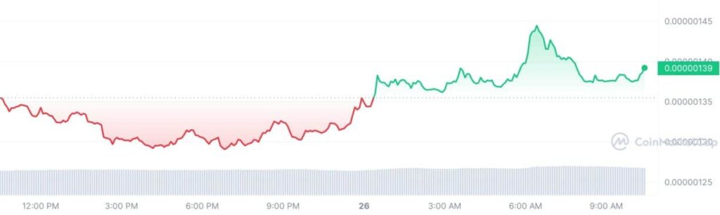 La criptomoneda Pepe Coin (PEPE), una popular criptomoneda meme, registró hoy un repunte notable. En el momento de esta publicación, el precio de Pepe Coin subió un 2,83% a 0,000001388 dólares con una valoración de mercado de 585,12 millones de dólares. Además, su volumen comercial de 24 horas aumentó un 12,56% a 164,20 millones de dólares.