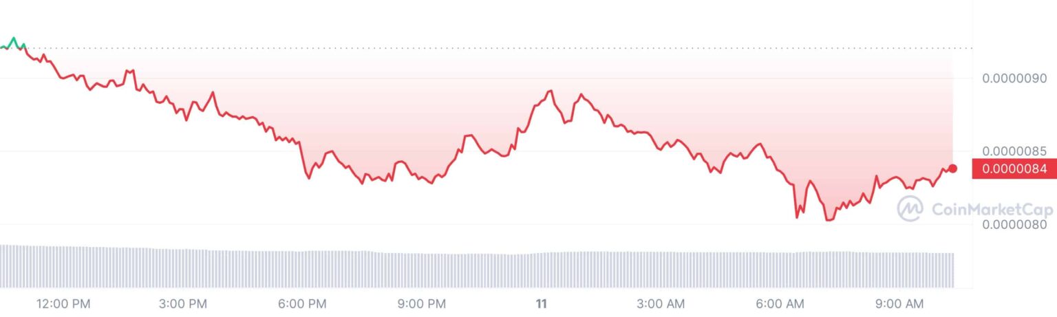 La criptomoneda Pepe Coin (PEPE), una popular moneda meme, se desplomó significativamente hoy. En el momento de esta publicación, el precio de Pepe Coin bajó un 8,89% a 0,000008381 dólares con una valoración de mercado de 3,53 mil millones de dólares. Además, su volumen comercial de 24 horas se desplomó un 20,23% hasta los 1.260 millones de dólares.
