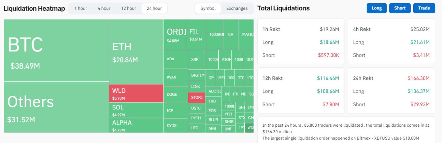 moneda de vidrio datos muestra que la reciente caída de precios causó aproximadamente $166 millones en pérdidas para aproximadamente 85,000 comerciantes de criptomonedas con posiciones activas en el mercado.
