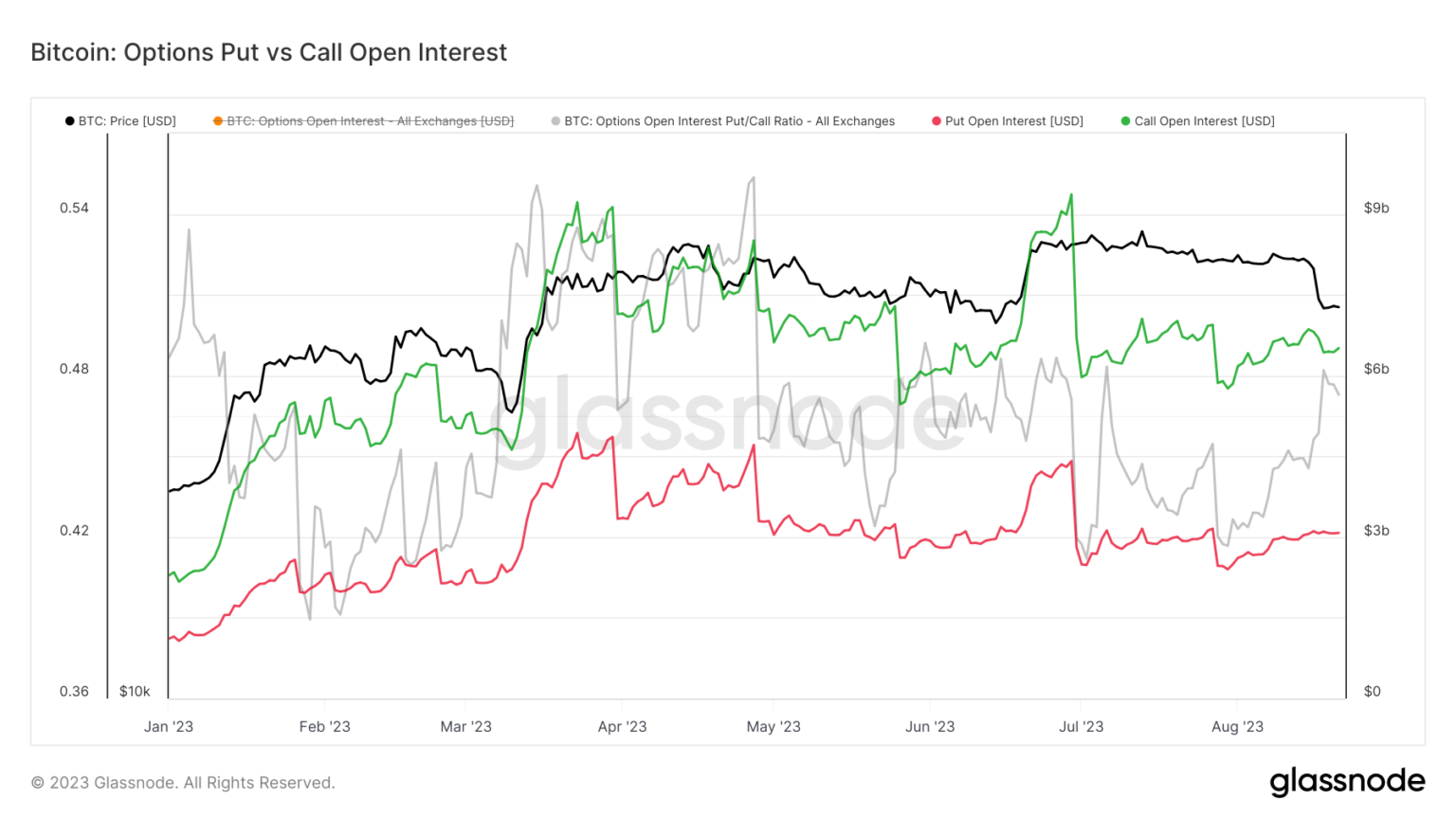 Por otro lado, el mercado de opciones se mantuvo notablemente resistente durante la caída del precio de Bitcoin. Los datos de Glassnode mostraron un interés abierto constante tanto para las opciones de compra como para las de venta, lo que indica que estos instrumentos no se vieron afectados en gran medida por la volatilidad del mercado.