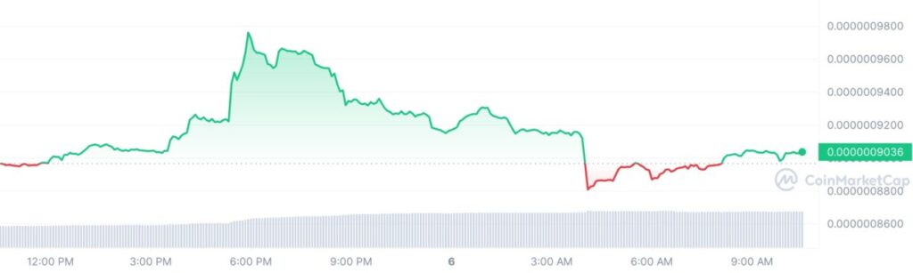 Pepe Coin (PEPE), una de las criptomonedas meme de tendencia, experimentó un ligero repunte hoy. En el momento de esta publicación, el precio de Pepe Coin subió un 1,86% a 0,0000009047 dólares con una valoración de mercado de 379,83 millones de dólares. Además, su volumen comercial de 24 horas se disparó un 70,79% hasta los 89,55 millones de dólares.
