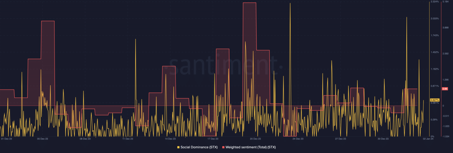 Al igual que la dominancia social, la lectura del sentimiento ponderado también aumentó. El sentimiento ponderado rastrea los comentarios positivos/negativos sobre un token. Por lo tanto, el sentimiento ponderado en 0,84 sugiere que los actores del mercado son optimistas sobre el proyecto Stacks.