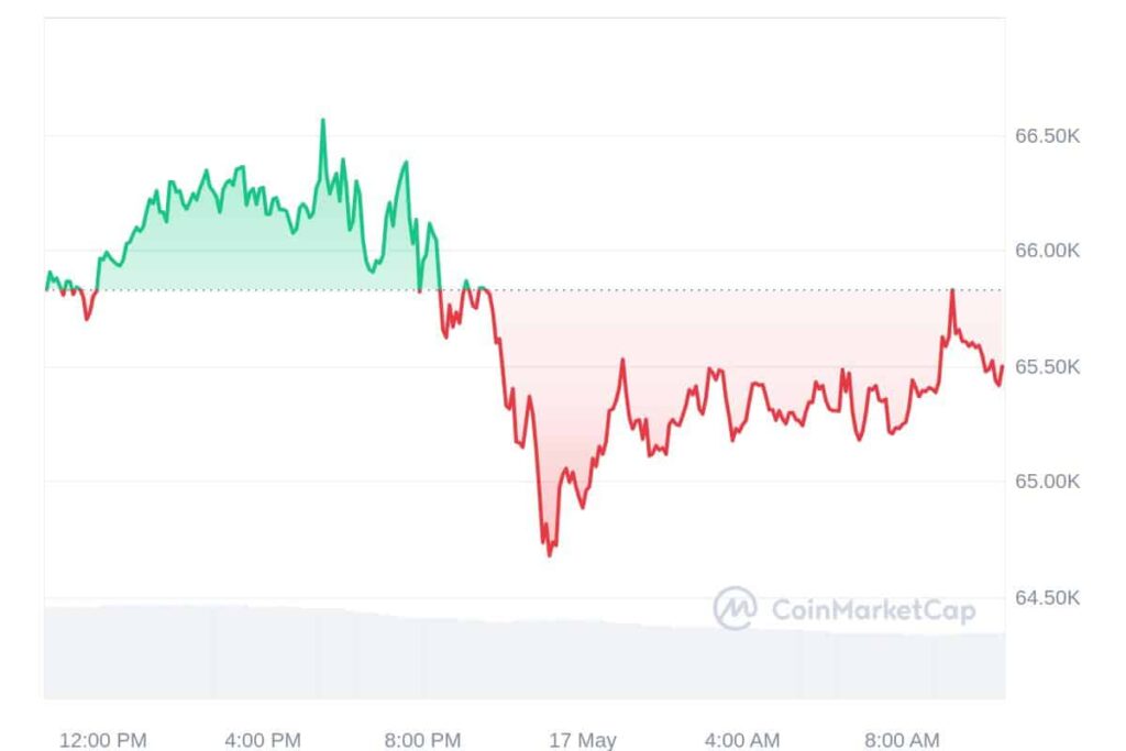 El precio de Bitcoin cayó 0,52%, alcanzando $65,499.97 al momento de escribir este artículo el viernes 17 de mayo. Por otro lado, su volumen de operaciones se desplomó un 28,74% a $29,90 mil millones en las últimas 24 horas. Mientras que la capitalización de mercado de la criptomoneda se situó en 1,29 billones de dólares.