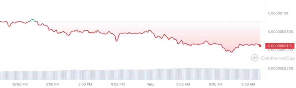 La Pepe Coin (PEPE), una criptomoneda meme, se desplomó significativamente. En el momento de esta publicación, el precio de Pepe Coin bajó un 6,87% a 0,0000009112 dólares con una valoración de mercado de 412,11 millones de dólares. Por el contrario, su volumen comercial de 24 horas aumentó un 29,82% hasta los 98,92 millones de dólares.