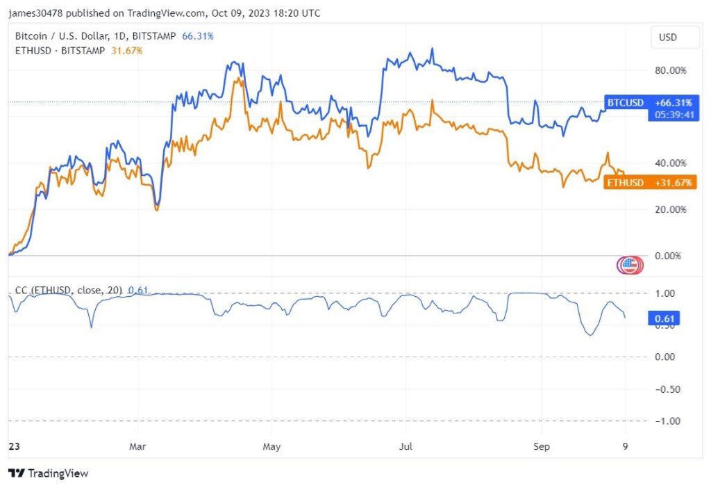 - La correlación de Ethereum con Bitcoin alcanzó un mínimo anual de 0,61.