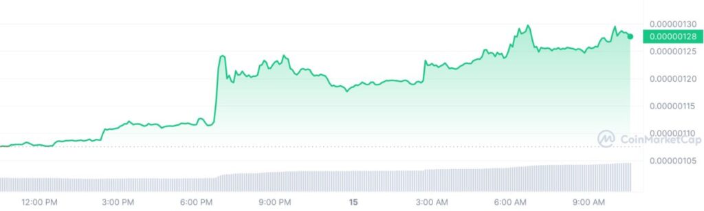 La criptomoneda Pepe Coin (PEPE), una criptomoneda meme publicitada, aumentó enormemente hoy. En el momento de esta publicación, el precio de Pepe Coin bajó un 18,86% a 0,00000128 dólares con una valoración de mercado de 538,83 millones de dólares. Además, su volumen comercial de 24 horas se disparó un 113,57% hasta los 227,15 millones de dólares.
