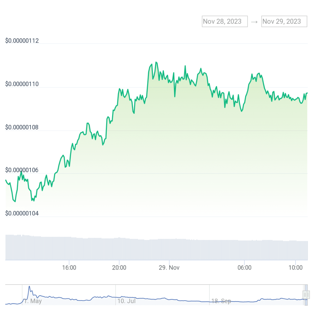 El precio de Pepe Coin (PEPE) se cotizaba a 0,00000110 dólares, lo que supone un aumento del 3,59 % en las últimas 24 horas y un aumento del 1,34 % en los últimos 7 días. El volumen de operaciones de 24 horas para PEPE es de 44,45 millones de dólares, lo que demuestra una participación activa en el mercado.