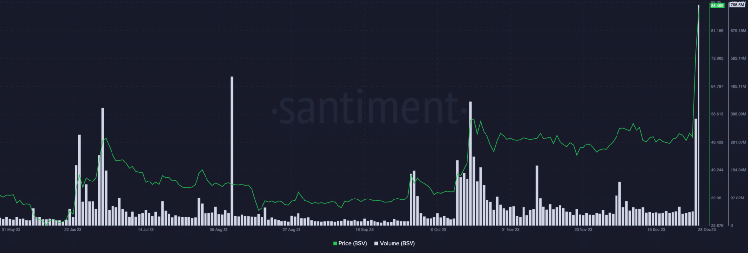 AMBCrypto descubrió que el volumen de operaciones de BSV ascendió a 615 millones de dólares en las últimas 24 horas, aumentando más del 600%. Según datos de sentimientoesto marca el volumen de operaciones más alto de la moneda en un solo día desde junio de 2021.