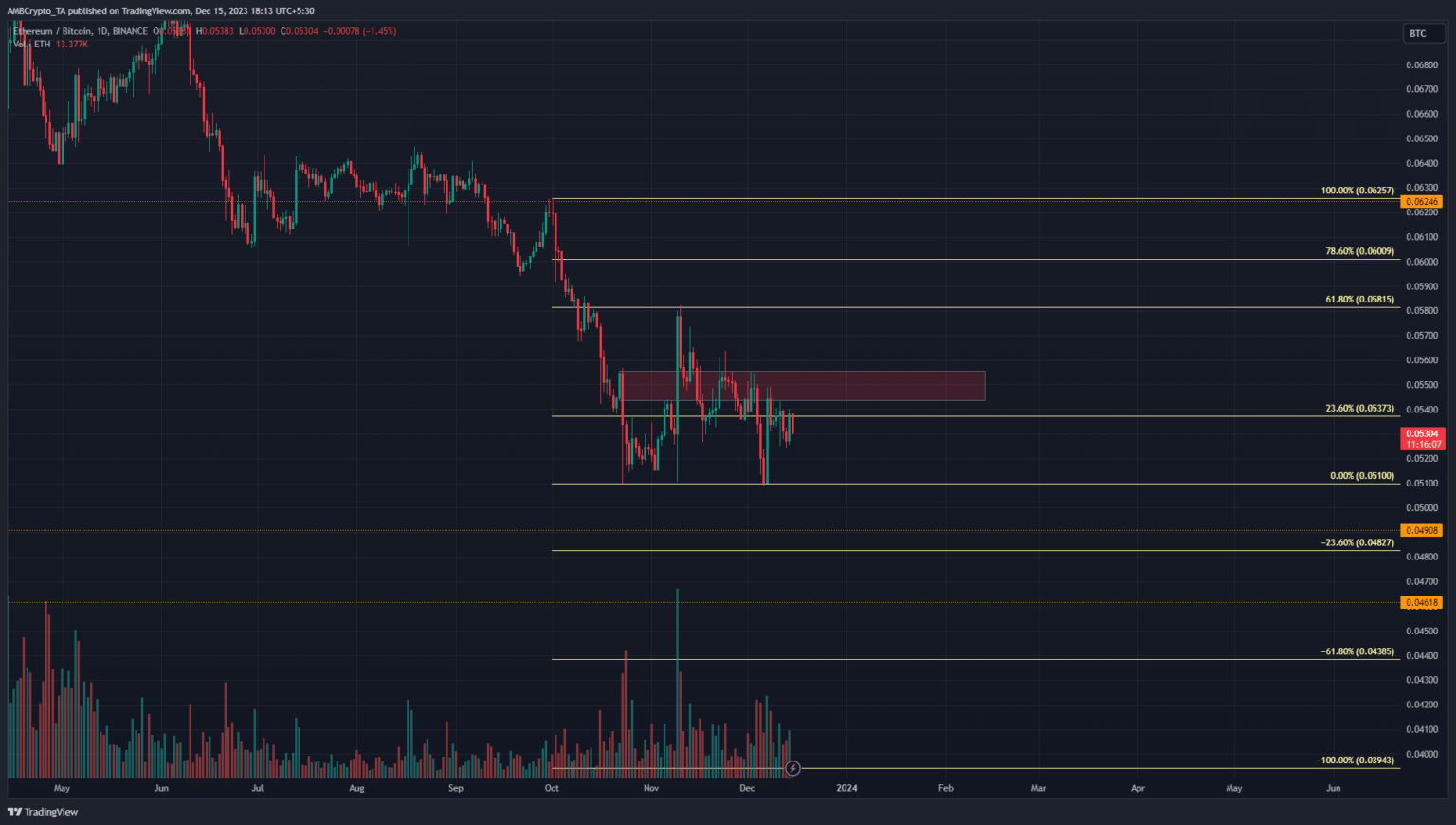 La zona de resistencia resaltada en la región de 0.055 representó una zona de resistencia clave que los alcistas de ETH deberán romper para revertir su suerte. Sin embargo, la estructura del mercado era bajista.