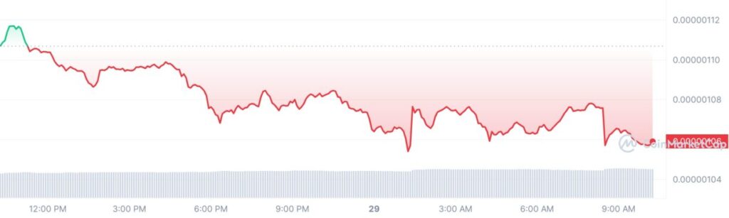 Pepe Coin (PEPE), una criptomoneda meme de tendencia, extendió caídas significativas en la sesión de negociación de hoy. El precio de Pepe Coin cayó un 4,11% a 0,000001061 dólares con una valoración de mercado de 444,60 millones de dólares. Sin embargo, su volumen comercial de 24 horas aumentó un 18,80% a 50,32 millones de dólares.
