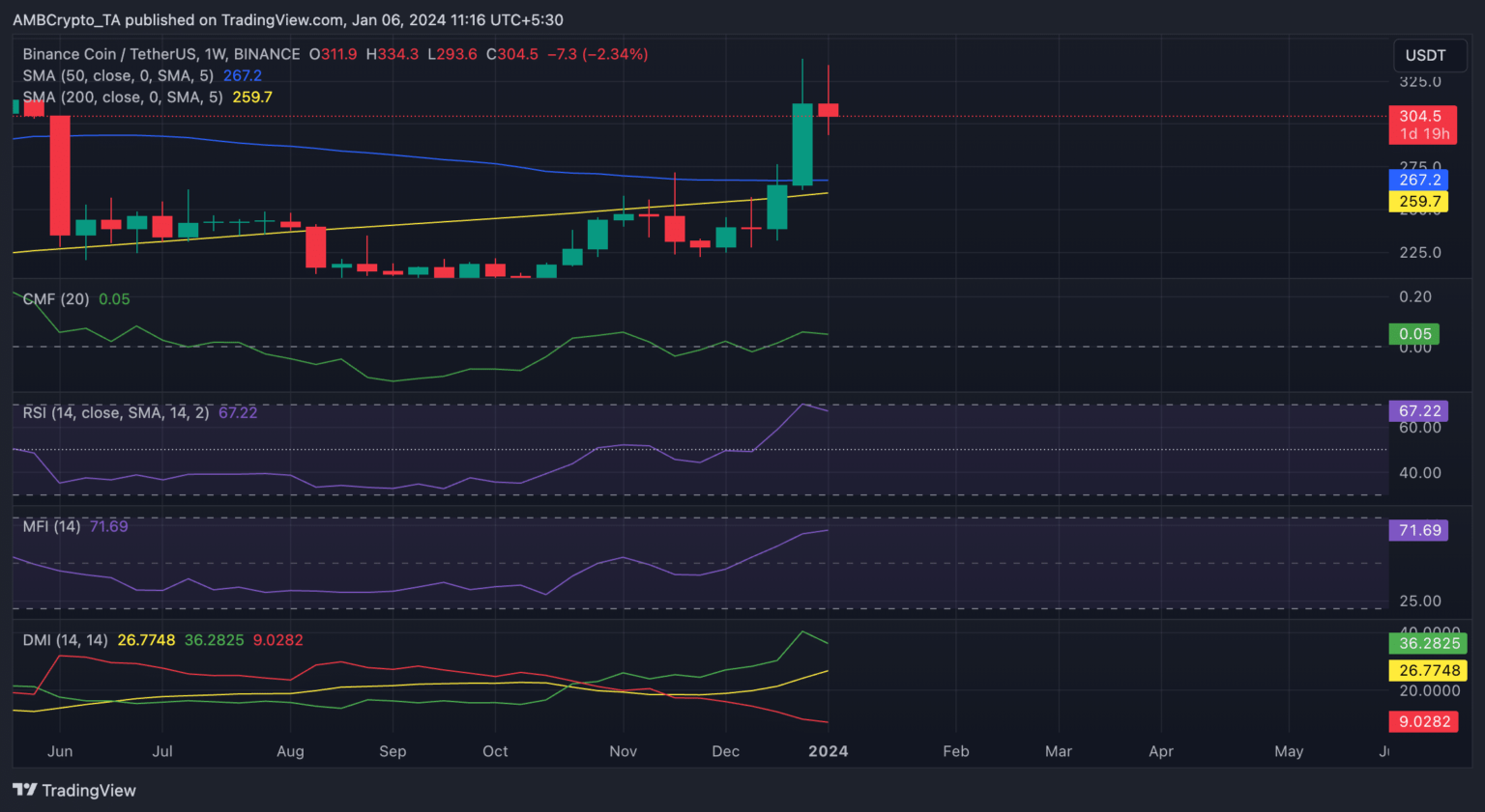 - La demanda continúa impulsando el repunte del BNB en un gráfico semanal.