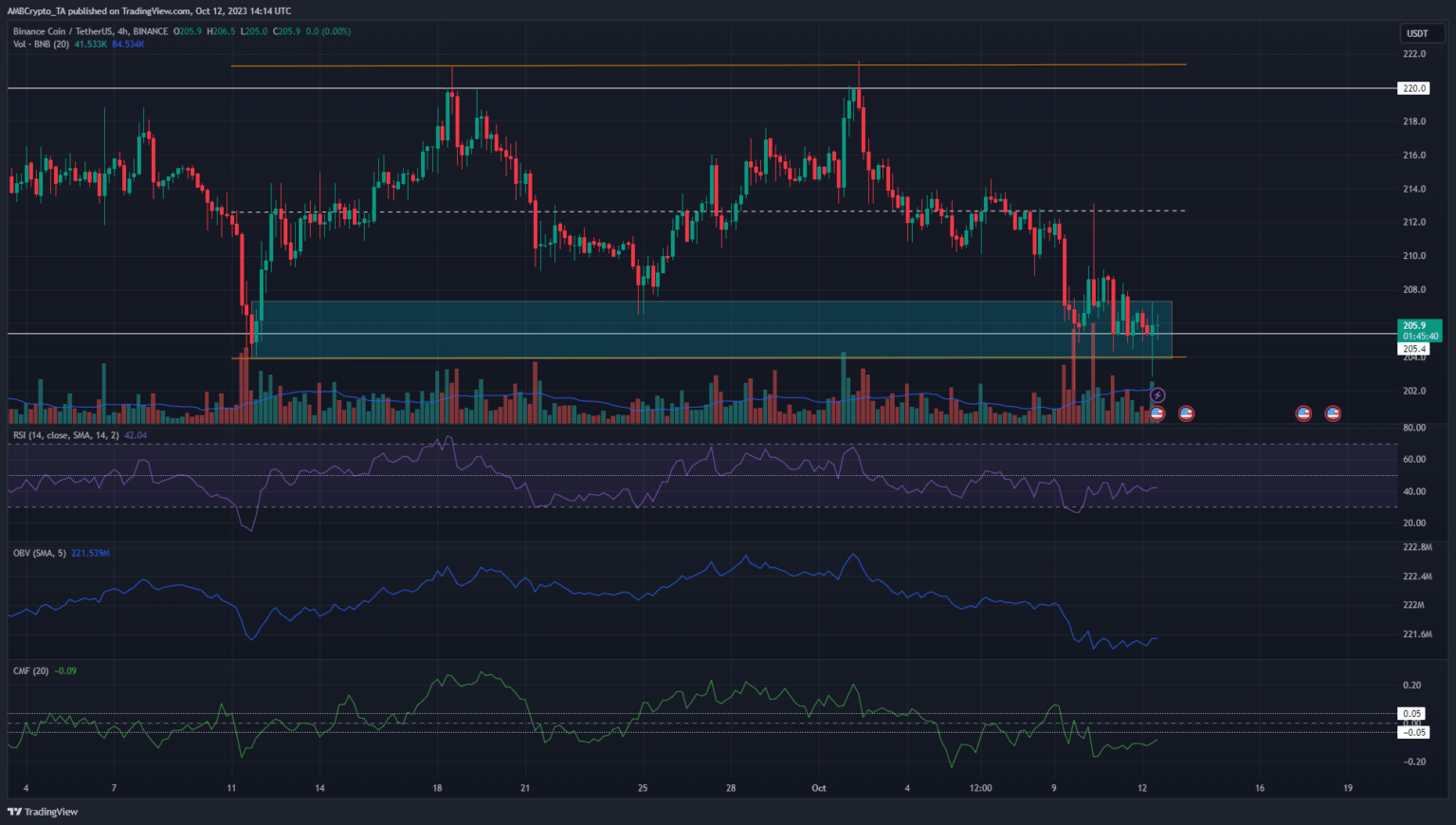 En un análisis reciente, AMBCrypto señaló el 10 de octubre que era probable que se rompiera el soporte de 205 dólares. Si bien el token de intercambio cayó a $ 202,8, aún no se materializó una ruptura a la baja. Esto es lo que los comerciantes pueden anticipar en el futuro.