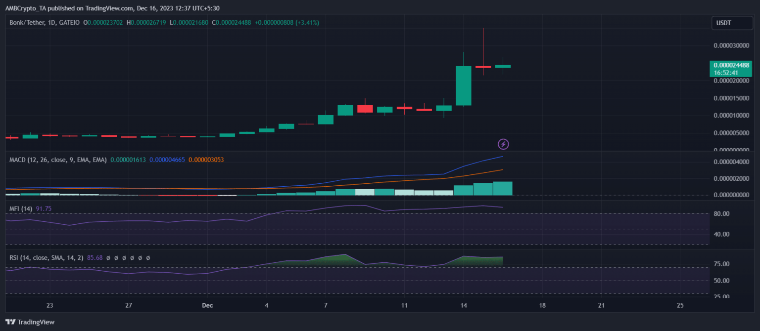 El índice de fuerza relativa (RSI) y el índice de flujo de dinero (MFI) de memecoin estaban ambos en zonas de sobrecompra, lo que puede ejercer una mayor presión de venta y, a su vez, hacer bajar el precio de la moneda meme. No obstante, el MACD siguió estando a favor de los alcistas.