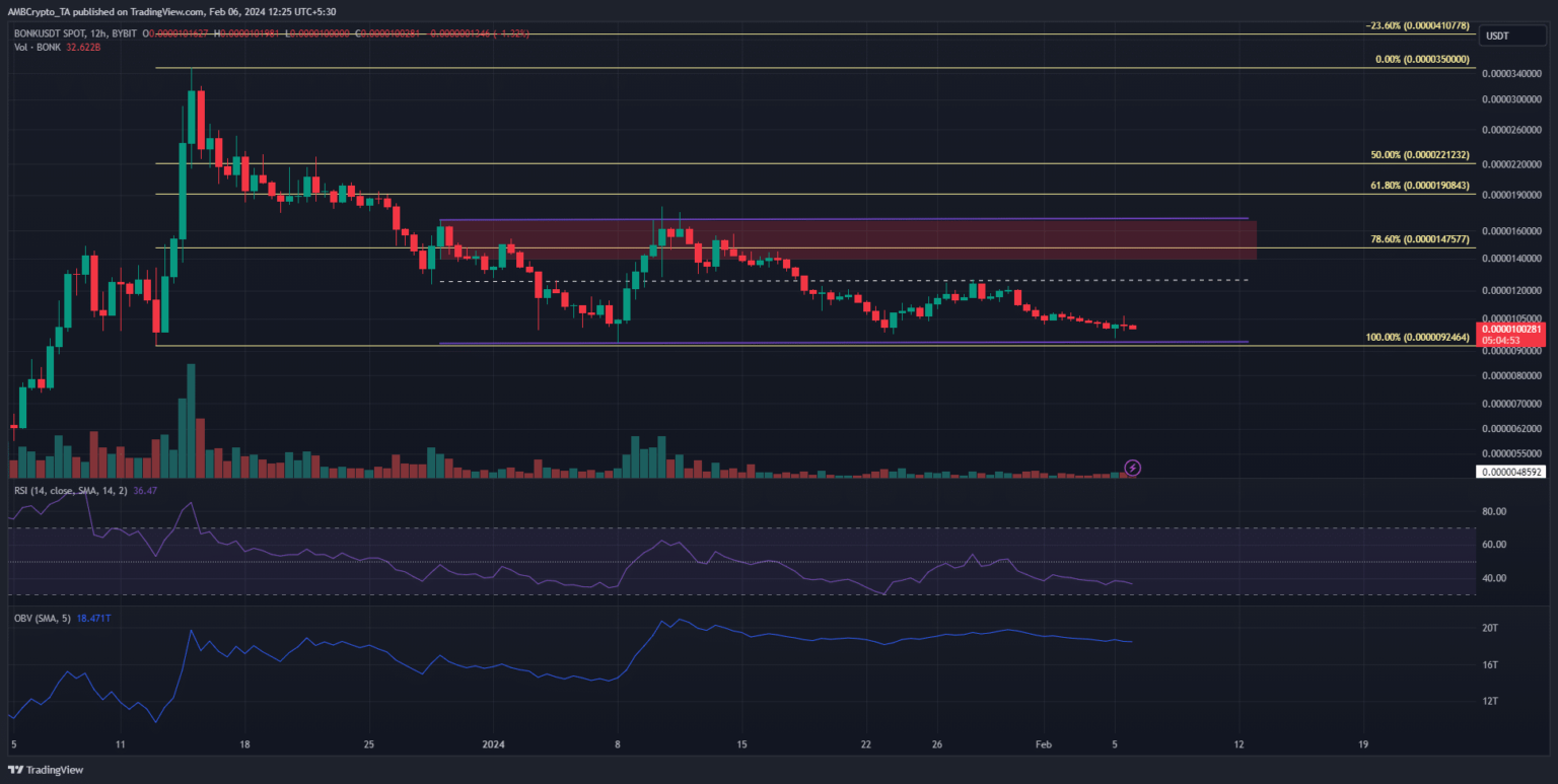 - BONK exhibió un impulso y una estructura bajistas.