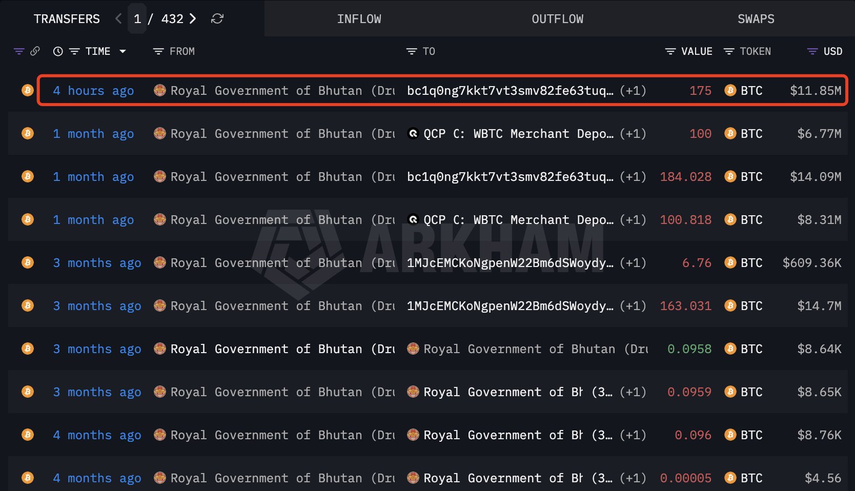 De acuerdo a datos de arkhamBután movió 175 BTC (11,85 millones de dólares) de sus principales direcciones de tenencia. Esta medida indica planes para deshacerse de estas monedas y es la última transferencia del gobierno mientras continúa recortando sus tenencias de Bitcoin.