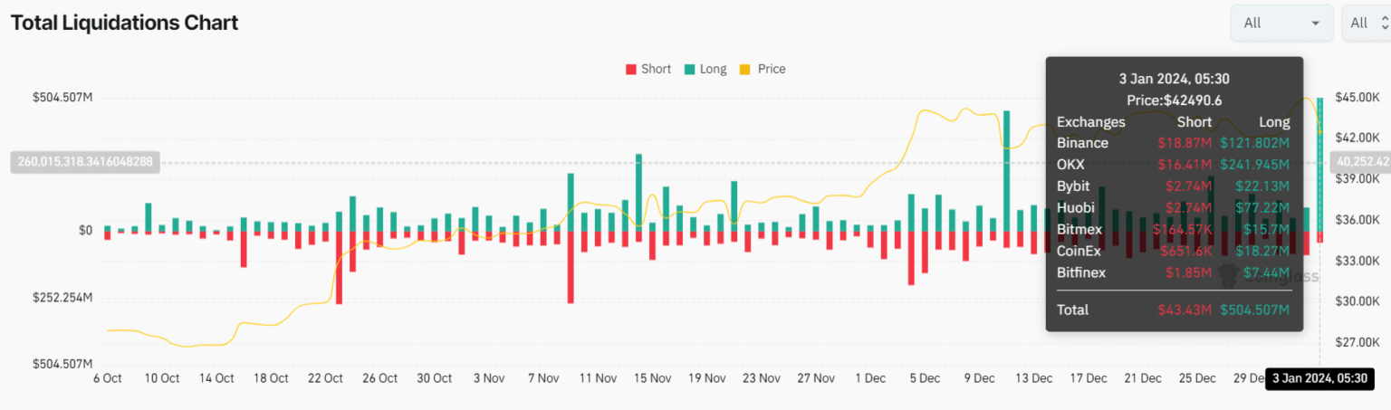 El mercado de criptomonedas experimentó una liquidación de más de 600 millones de dólares en las últimas 24 horas, de los cuales 500 dólares se liquidaron en sólo una hora. Los datos de Coinglass indican una liquidación masiva de posiciones largas de más de $561 millones de dólares hoy, 3 de enero. Más de 176.000 Los comerciantes fueron liquidados en las últimas 24 horas, con la orden de liquidación más grande en Huobi’s BTCUSDT valer 14,26 millones de dólares.