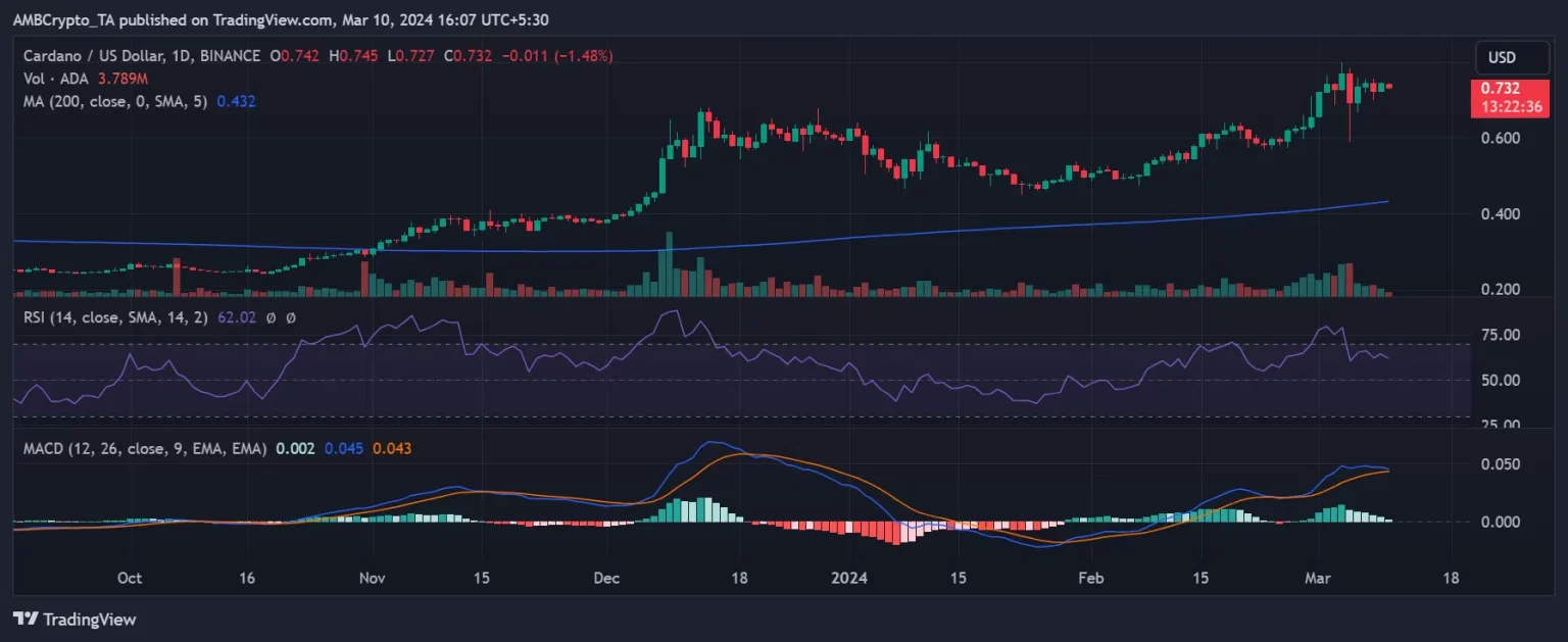 El 4 de marzo, Cardano experimentó un notable aumento de valor del 5,77%, lo que elevó su precio a 0,770 dólares, según el análisis de AMBCrypto de su cronograma diario.