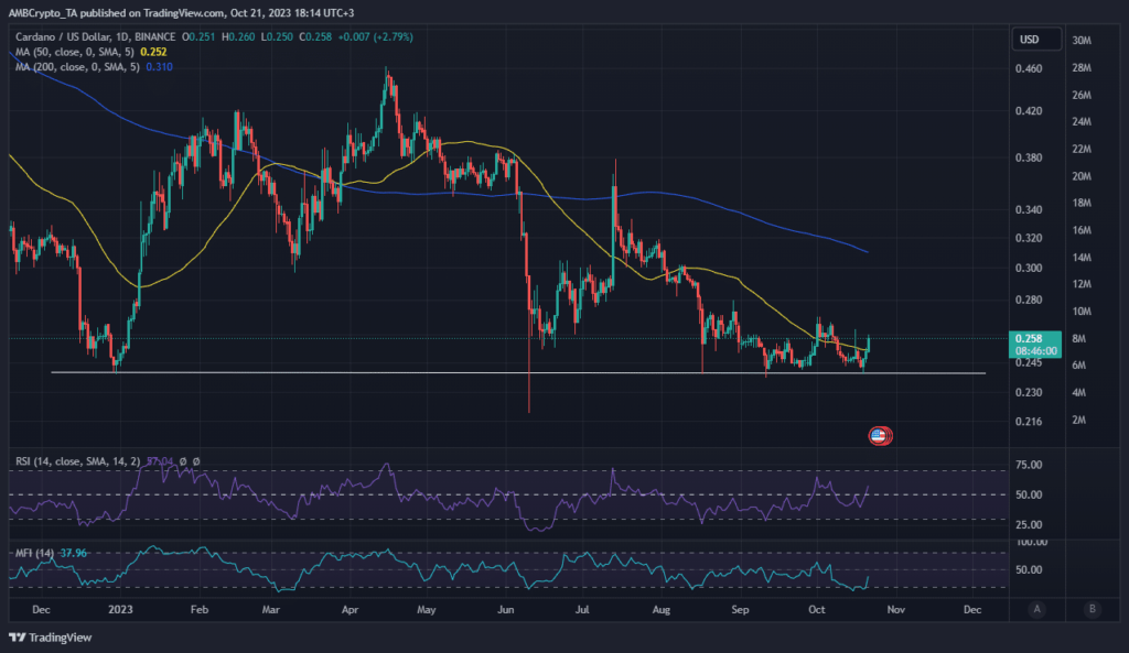 ADA ya ha emprendido un saludable intento alcista, a juzgar por su precio de 0,26 dólares al momento de esta publicación, que representó un repunte del 8% desde el nivel de soporte. En cuanto a su indicador, observamos un aumento de la fuerza relativa en los últimos días, acompañado de un aumento en las entradas de liquidez, según indicó la IMF.