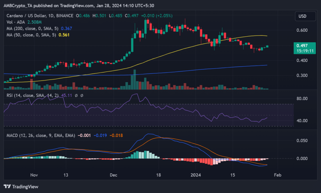 Esto marcó una recuperación de las tendencias bajistas anteriores que comenzaron alrededor del 13 de enero, cuando el precio rondaba los 0,58 dólares. Al cierre de esta edición, ADA cotizaba a alrededor de 0,49 dólares, lo que muestra un aumento de más del 2%.