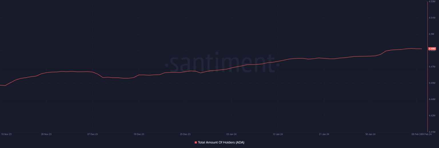 El análisis de la cantidad total de tenedores de Cardano en Santiment mostró que no ha habido una tendencia significativa en los últimos meses.