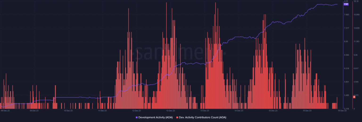 Cardano [ADA] La actividad de desarrollo ha aumentado constantemente durante los últimos siete días. Esto parecía optimista, ya que sugería que los desarrolladores estaban haciendo más esfuerzos para mejorar la red.