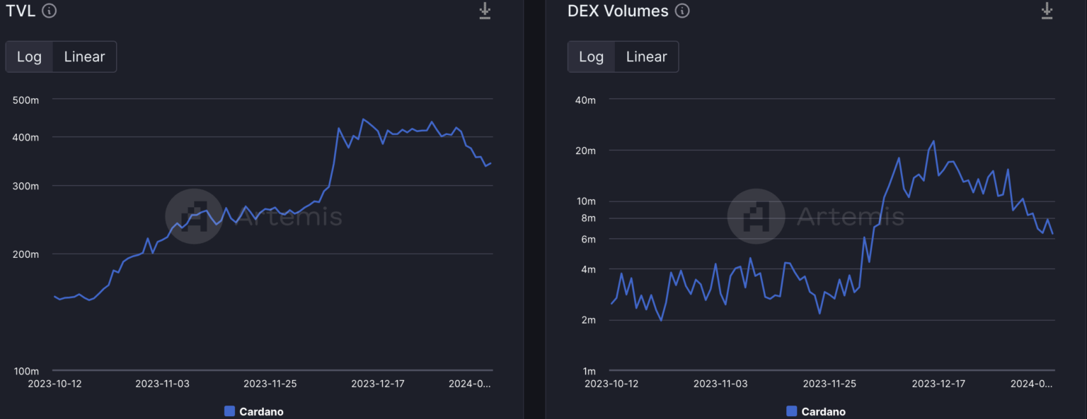 Cardano también enfrentó reveses en el ámbito de las finanzas descentralizadas (DeFi), con caídas en los volúmenes de Valor Total Bloqueado (TVL) y de Intercambio Descentralizado (DEX).