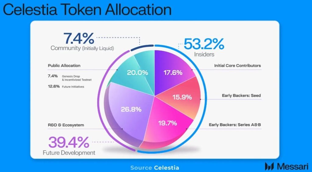 La mayor parte del suministro de tokens se asignó a personas internas, lo que en realidad no se ajusta al ideal de propiedad comunitaria total. Una posible razón detrás de esta asignación podría ser que Celestia es más bien una empresa que necesita una alta financiación inicial de capital previo al producto.