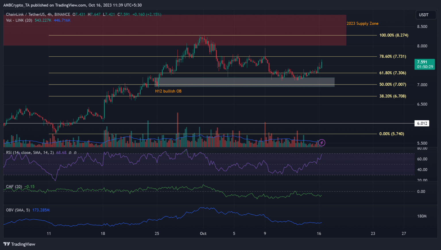 La recuperación masiva de LINK en septiembre fracasó en la zona de oferta de 2023 de 8,0 a 8,8 dólares (rojo). El retroceso que siguió se alivió en el nivel psicológico de 7 dólares. Curiosamente, el nivel confluyó con el nivel de Fib del 50% y el orden alcista (OB) del H12.