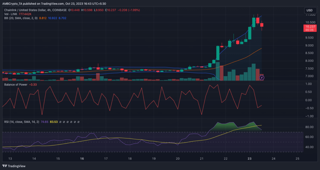 Al mismo tiempo, una corrección inminente podría estar en el camino considerando su historia. Bueno, el gráfico de cuatro horas del LINK/USD mostró que la tendencia alcista del token estaba empezando a perder su dominio. Esto se debió a que la subida a 10,83 dólares fue anulada por un rechazo y cayó a 10,21 dólares.