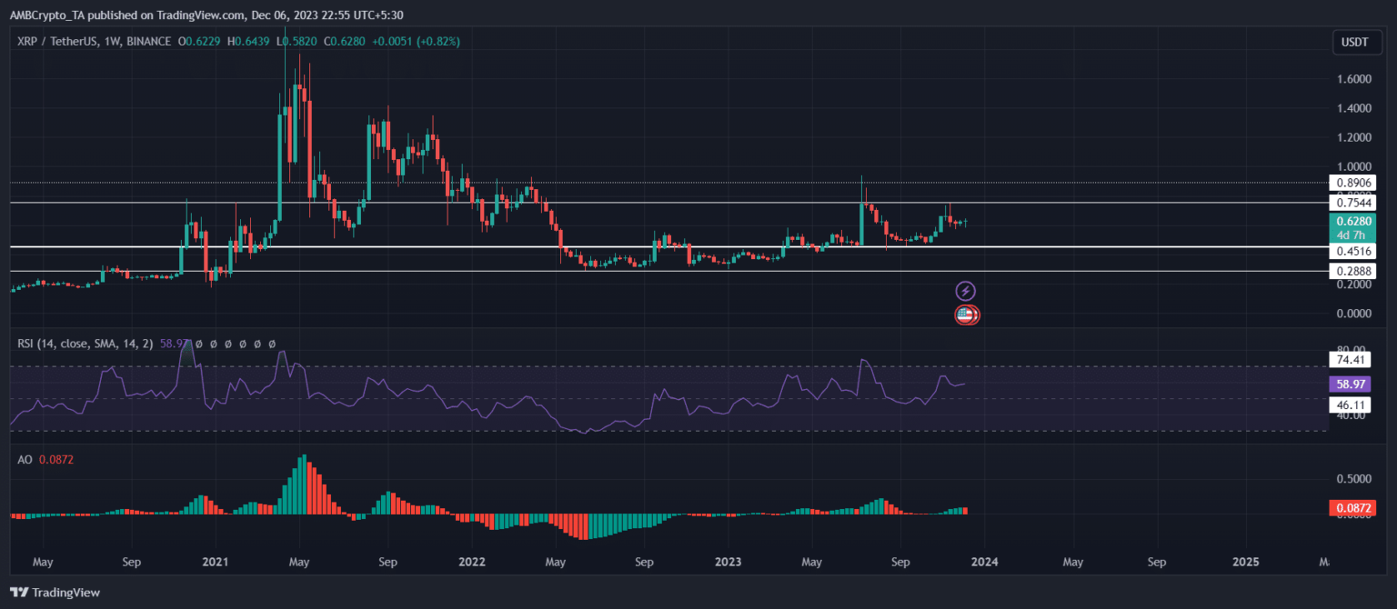 XRP registró un aumento inicial inmediatamente después del fallo judicial. En el momento de esta edición, la criptomoneda se cotizaba a 0,62 dólares. Si puede superar el nivel de resistencia de 0,75 dólares, entonces podrá ver cómo su impulso positivo gana fuerza. Lo mismo fue subrayado por el índice de fuerza relativa (RSI) que se ubicó justo por encima de la marca 50, ubicándose en 58. Por el contrario, el Awesome Oscillator mostró signos de un retroceso en las cartas, con velas rojas parpadeando.